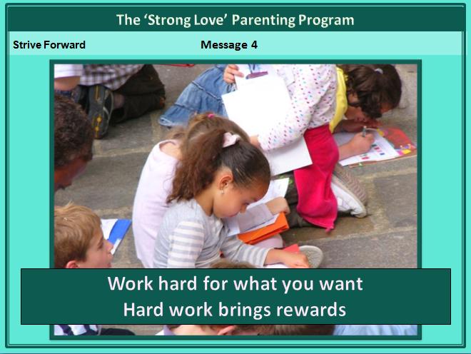 That’s why the fourth Message in the ‘Strong Love’ parenting approach is …. work hard for what you want, hard work brings rewards.